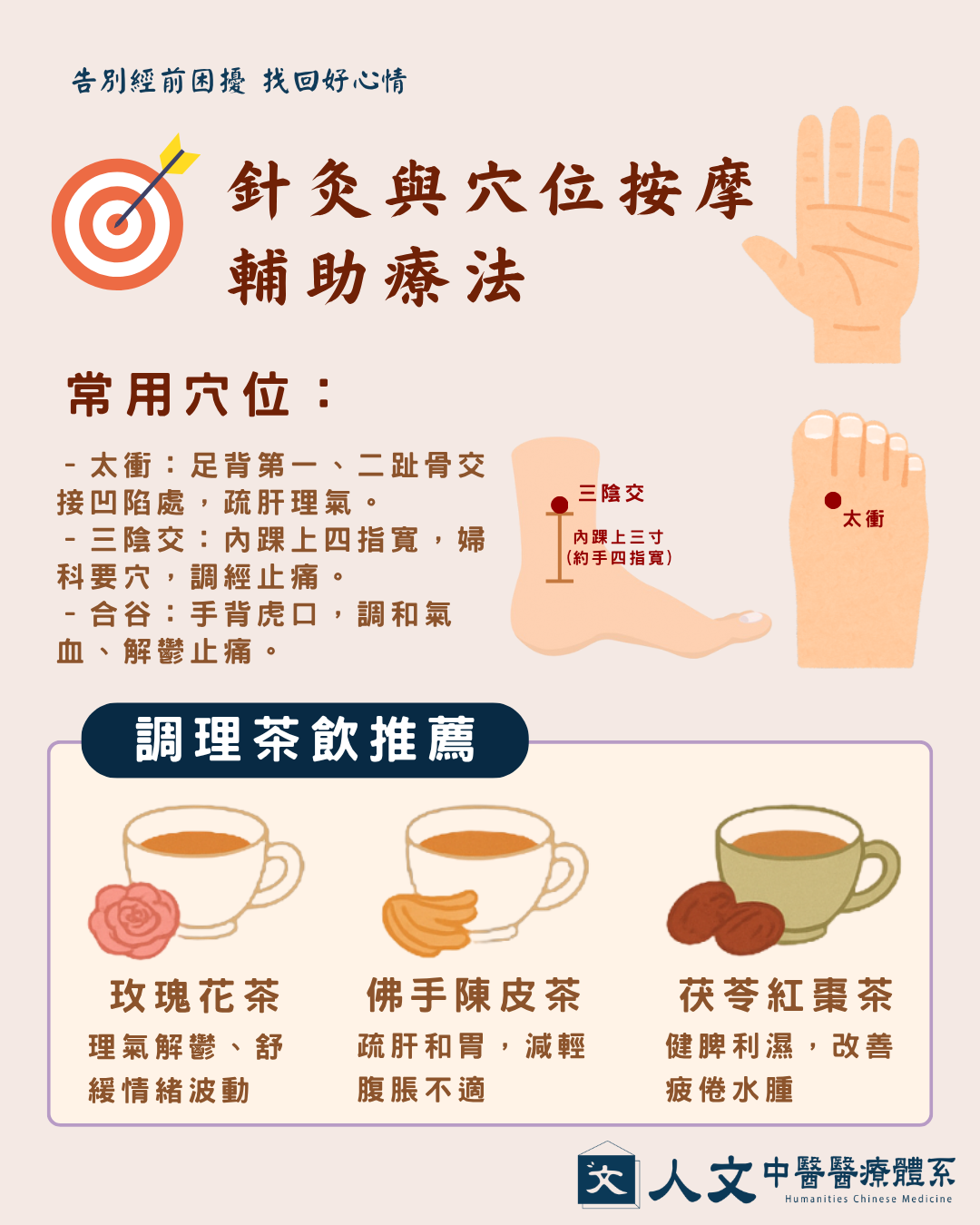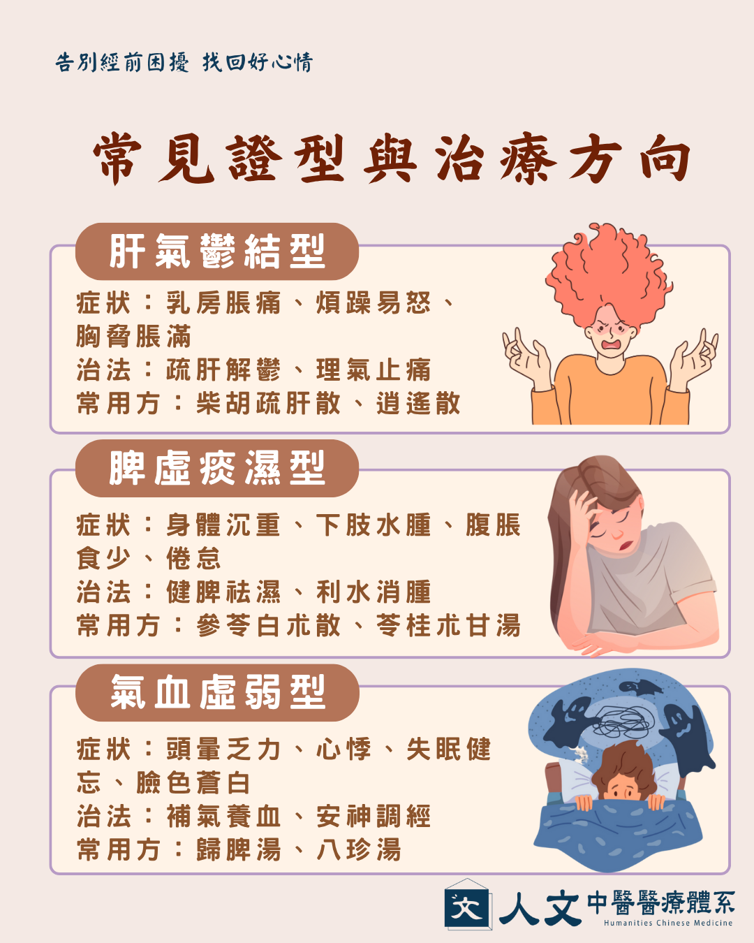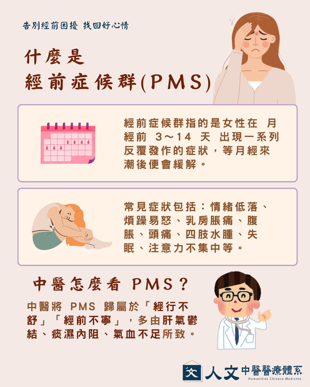 中醫將 PMS 歸屬於「經行不舒」「經前不寧」,多由 肝氣鬱結、痰濕內阻、氣血不足 所致。治療上以 疏肝解鬱、健脾化濕、補氣養血 為主,調暢情志,平衡陰陽。