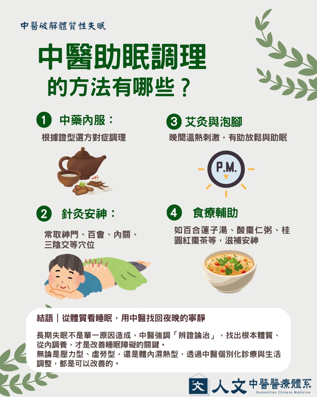 🌿 1. 中藥內服:根據證型選方對症調理 💆 2. 針灸安神:常取神門、百會、內關、三陰交等穴位 🛁 3. 艾灸與泡腳:晚間溫熱刺激,有助放鬆與助眠 🍲 4. 食療輔助:如百合蓮子湯、酸棗仁粥、桂圓紅棗茶等,滋補安神